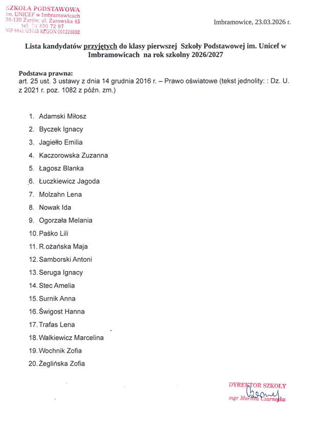 Lista dzieci przyjętych do pierwszej klasy w roku szkolnym 2026/2027